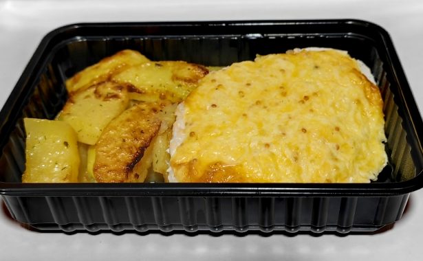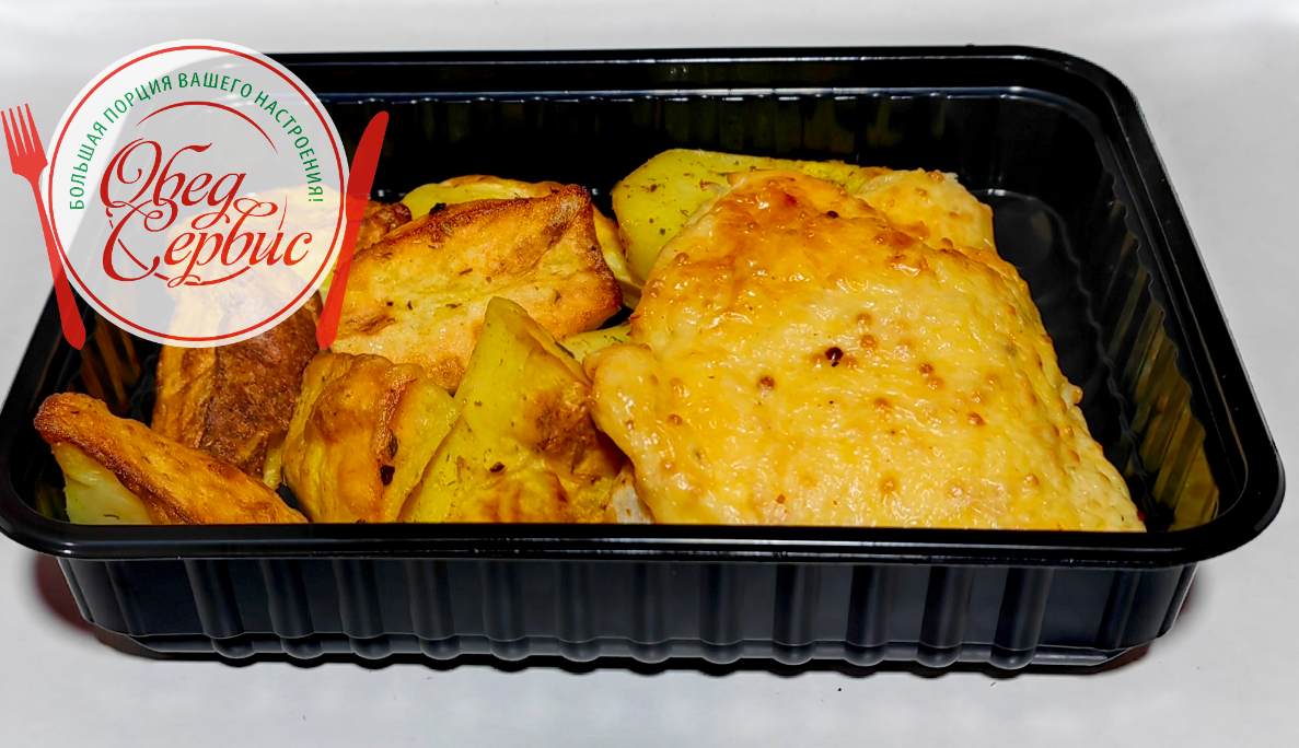 Филе рыбы, запеченное с огурчиком и сыром / Картофельные дольки