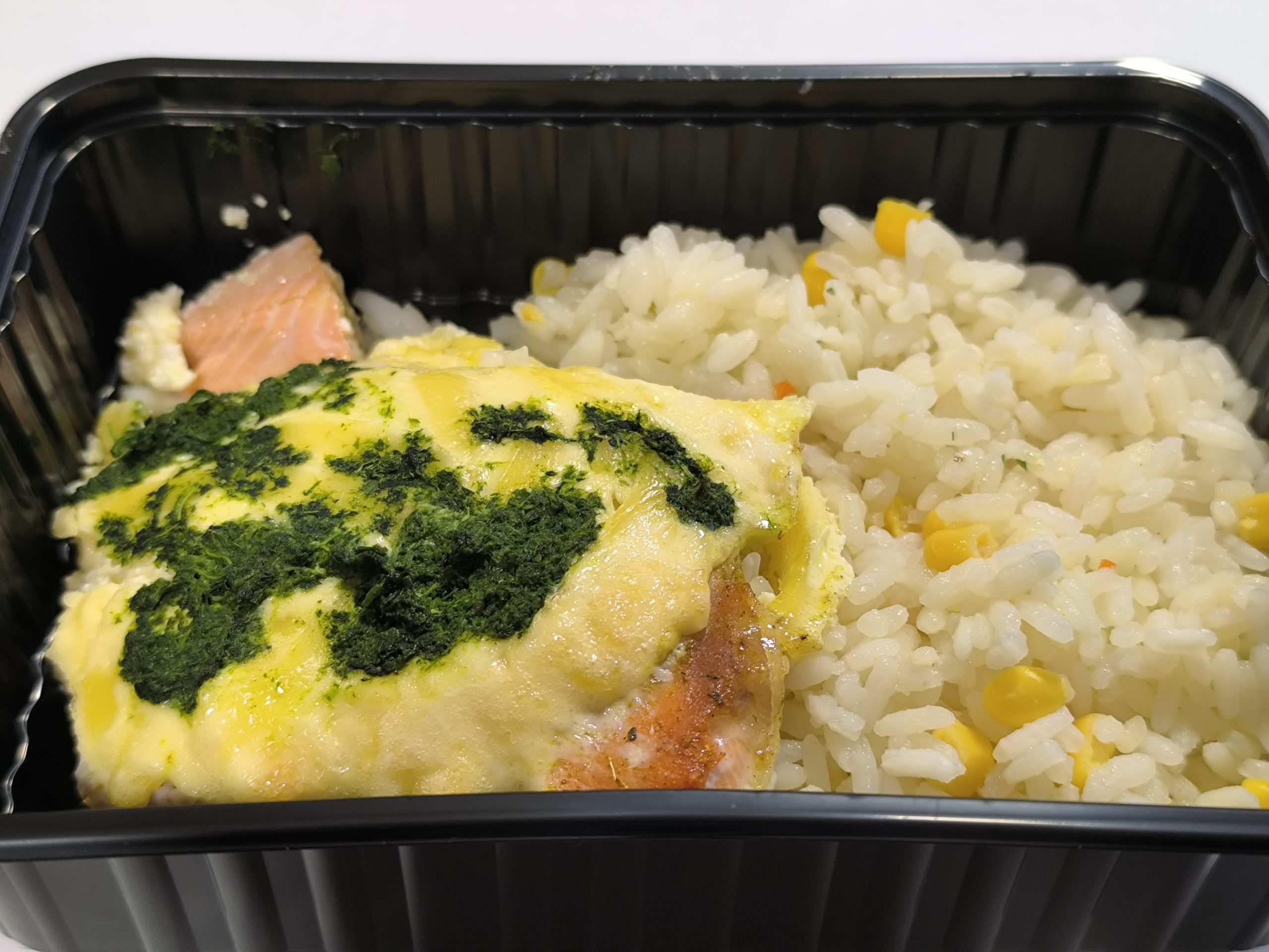 Горбуша, запеченная под сырно-шпинатной шапкой / Рис рассыпчатый с овощами