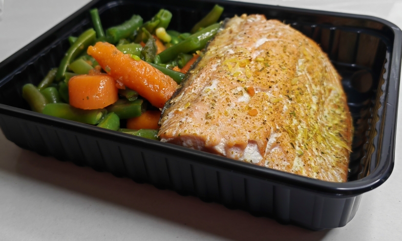 100/150филе горбуши,соль,специи,лимонный сок, фасоль стручковая, морковь