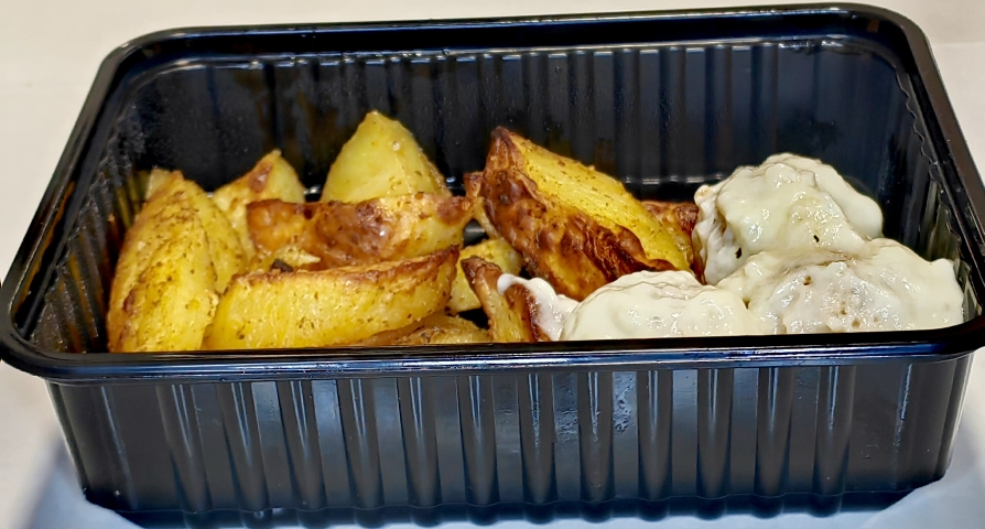 100/180фарш куриный, яйцо,сыр творожный, соус, соль, специи, картофель
