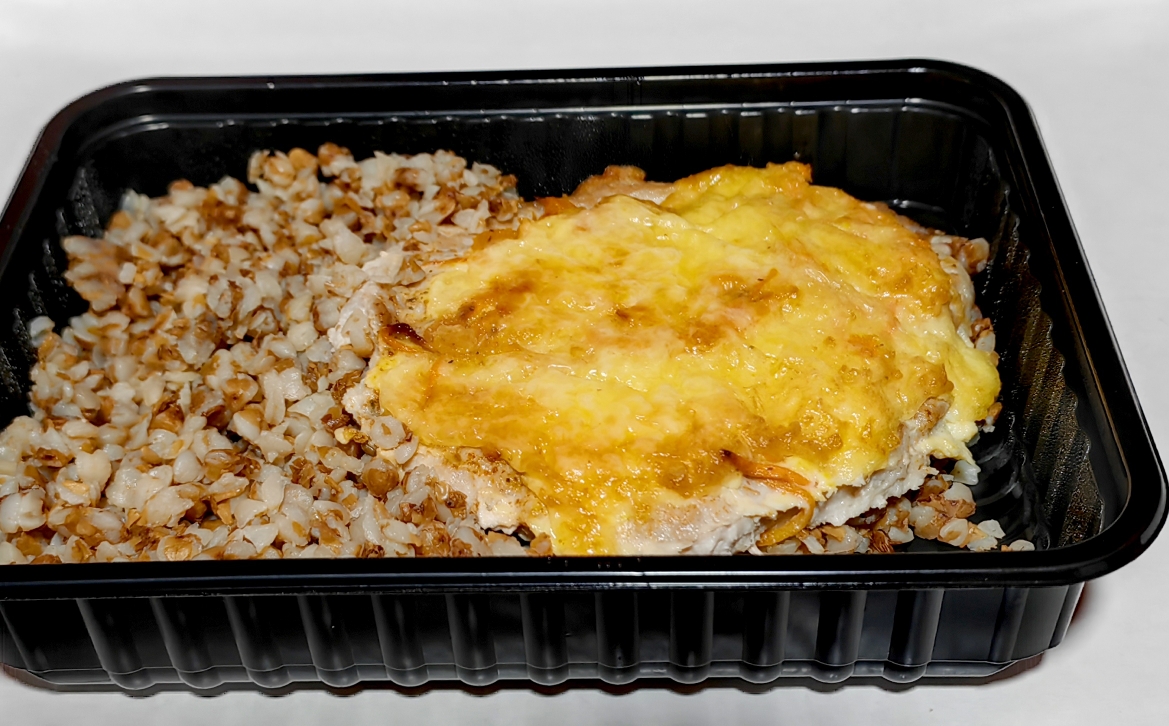 100/180свинина филей,томат,сыр,майонез,соль,специи,гречка