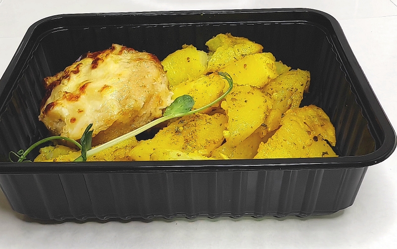 Котлета куриная с томатом / картофельные дольки с чесноком