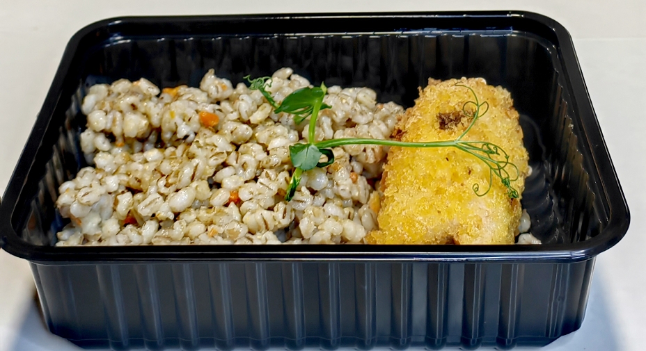 100/180свинина вырезка,шампиньоны, лук,пан.сухари Панко, соль,специи, перловка, лук, морковь