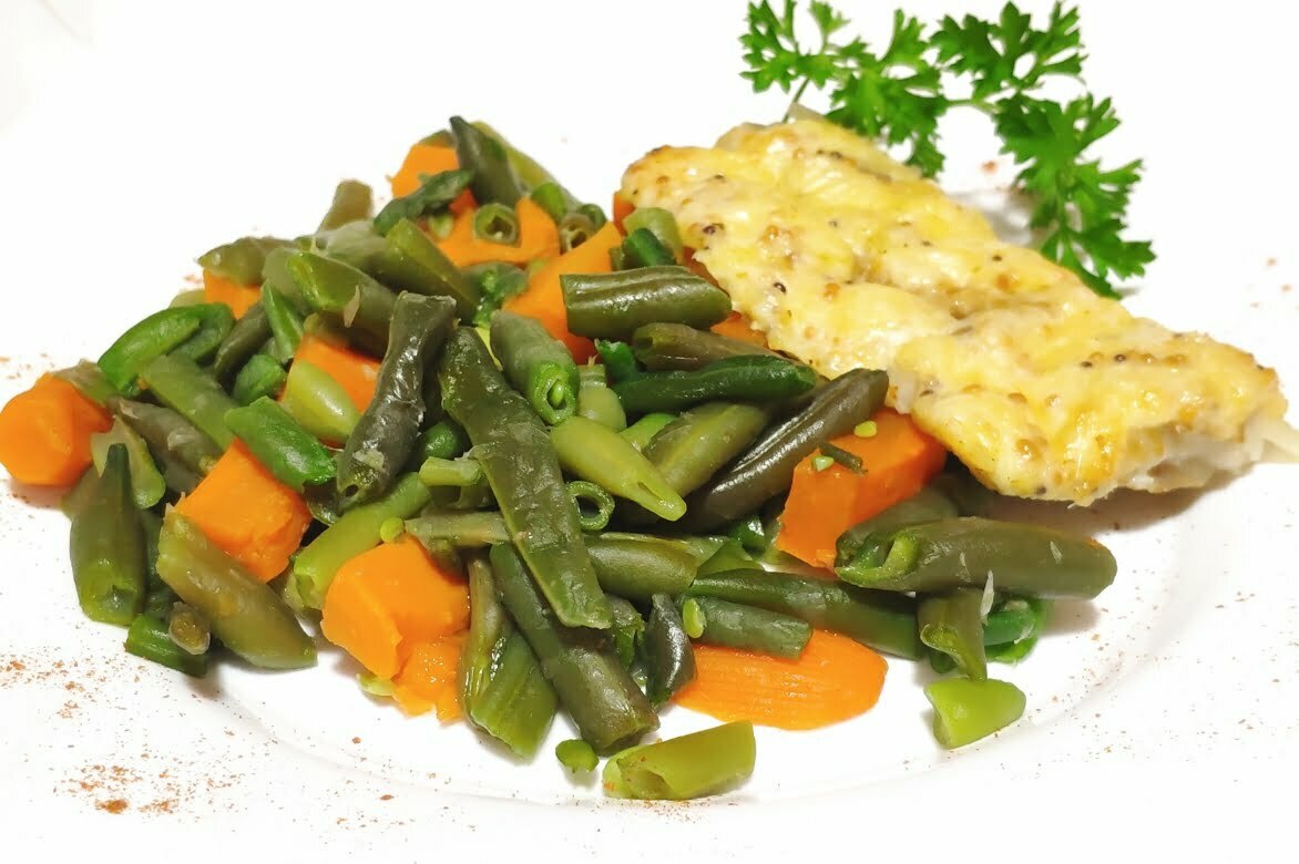 Филе рыбы, запеченная с французской горчицей / стручковая фасоль с морковью