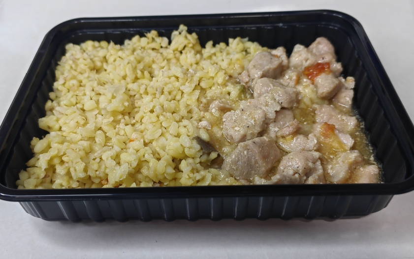 100/180свинина таз.,лук,морковь,томатная паста,соль,специи,булгур, овощи