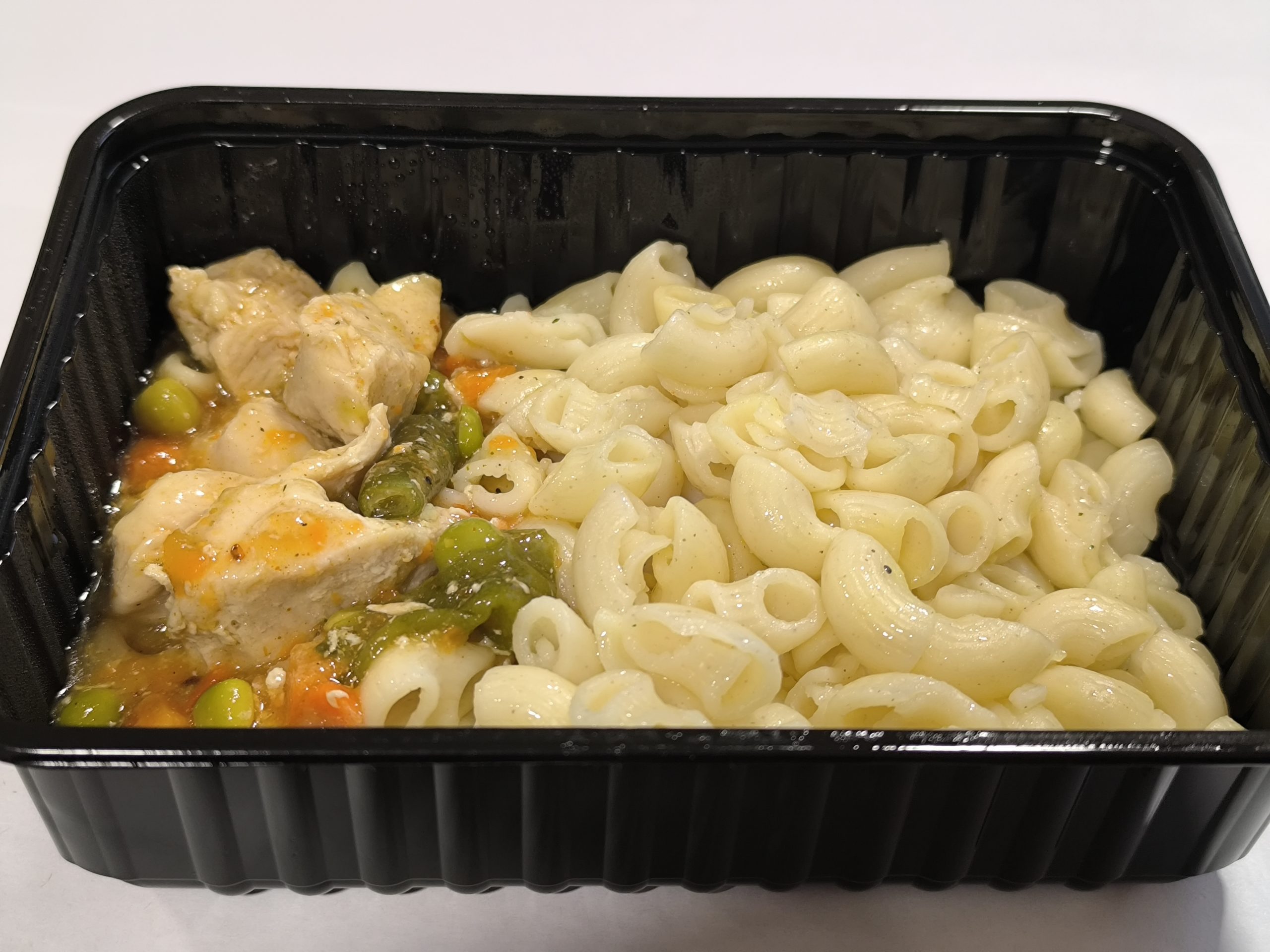100/180куриное филе,морковь,стручковая фасоль,лук, крахмал, соль,специи, макароны