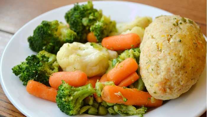 100/150фарш из мяса птицы, батон, яйцо, сыр, масло слив., специи, сухари панир., брокколи, морковь