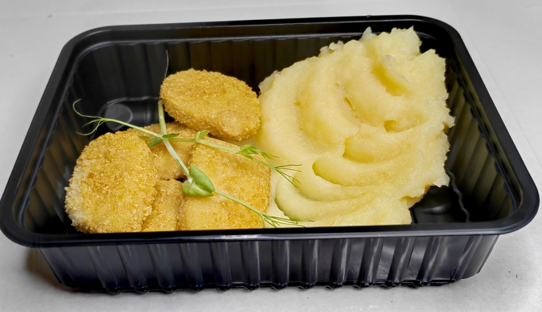 100/180куриное филе,яйцо,пан.сухари, соль,специи,картофель,соус,молоко,масло слив.