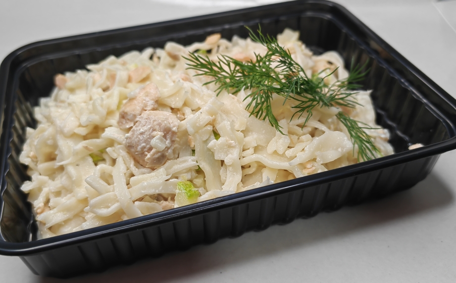 280лапша,лосось,кабачок,сливки,зелень, чеснок,соль