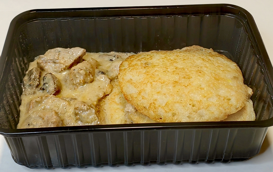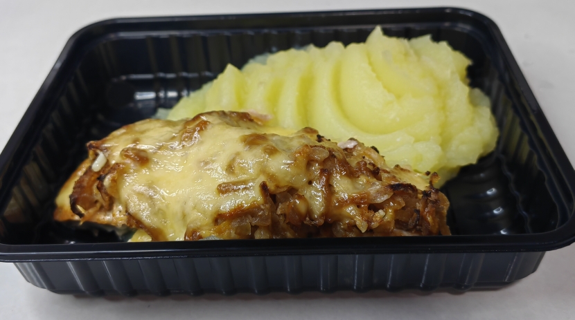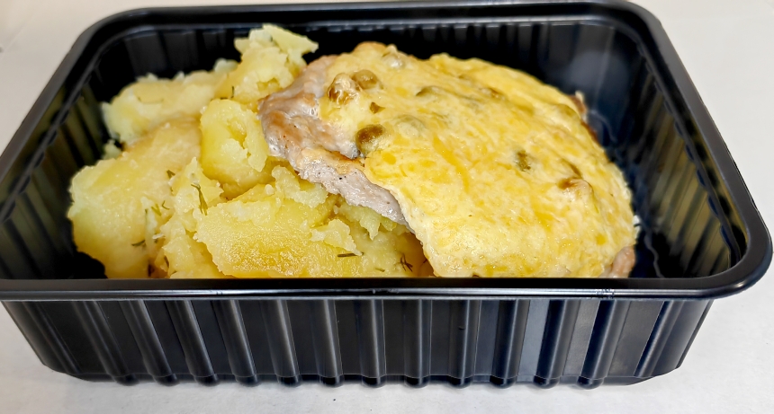 100/180свинина филей,горошек конс.,майонез,сыр,соль,специи,картофель,молоко,масло слив.