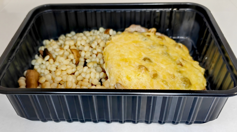 100/180свинина филей,горошек конс.,майонез,сыр,соль,специи,кускус, шампиньоны